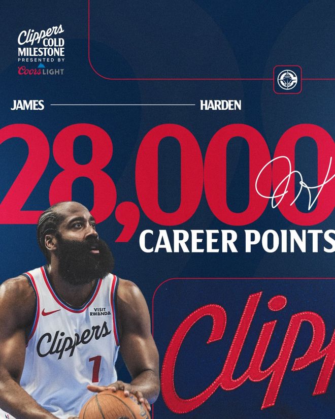 北京时间11月18日,快船客场108-110不敌76人,哈登贡献28分6篮板5助攻,其中首节就得到17分,但整场比赛投篮只有25中7,三分12中2,包括最后时刻两记三分绝杀球不中。在本场比赛中,哈登解锁了常规赛生涯28000分里程碑,成为NBA史上第11位做到这一点的球员。快船上半场结束领先76人10分,76人在末节成功逆转取胜。马克西轰下39分,乔治迎来个人赛季首秀,手感不佳,9中2得到9分。