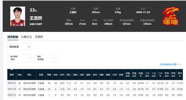 说起王浩然,很多球迷未必认识他,小伙子出生于2001年,在深圳男篮打球,一直都很低调,也没啥特别抢眼的表现。他在深圳男篮已经打了3个赛季,除了第一个是赛季只打了1场之外,上赛季和上上赛季才开始成为重要轮转。尤其是2024-25赛季,王浩然成为深圳队重要的首发球员,在场均28.3分钟时间里,能贡献11.3分3.5篮板2助攻,投篮命中率45.4%,三分球命中率30.1%。