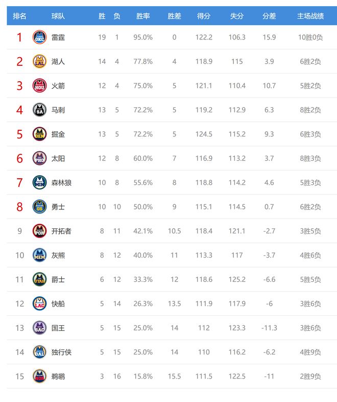 雷霆赢球后豪取11连胜,战绩19胜1负排名联盟第一,太阳输球后12胜8负排名西部第六。